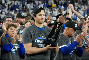 ![]() リーグ優勝決定シリーズのMVPに選ばれ、トロフィーを持つドジャースの大谷翔平(中央) =イマジンイメージズ・ロイター |
