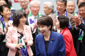 ![]() 出陣式で、笑顔を見せる高市早苗氏=2025年9月22日午前11時16分、国会内、上田幸一撮影 |