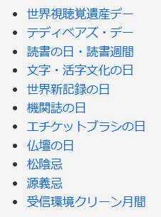 今日は何の日 (出典 雑学ネタ帳)![]() 世界視聴覚遺産デー(10月27日 記念日) 国際連合教育科学文化機関(United Nations Educational, Scientific and Cultural Organization:UNESCO、ユネスコ)が2006年(平成18年)に制定。 国際デーの一つ。「世界視聴覚遺産の日」ともされる。英語表記は「World Day for Audiovisual Heritage」。 1980年(昭和55年)のこの日、旧ユーゴスラビアのベオグラードで行なわれた第21回ユネスコ総会において、「動的映像の保護及び保存に関するユネスコ勧告」が採択された。映画・映像など視聴覚資料の重要性を多くの人に知ってもらうことが目的。 毎年テーマを掲げて、この日には世界各国でショートフィルムの上映会や視聴覚資料の展示会などのイベントが開催される。日本では映画保存協会(Film Preservation Society:FPS)などが実施している。 ![]() 世界視聴覚遺産デー 2009年(平成21年)、ユネスコは記念日のロゴを募集し、映画フィルムと再生ボタンをあしらったフィリピンのデザイナーAchilleus Coronel氏の作品が選ばれた。 |
