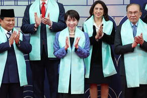 ![]() アジア太平洋経済協力会議(APEC)首脳会議の記念撮影で、拍手する高市早苗首相(右から3人目) =2025年11月1日午後0時26分、韓国・慶州、代表撮影 |