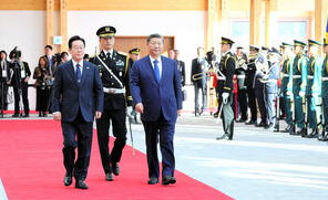 ![]() 国立慶州博物館での歓迎式に参加する習近平国家主席(右)と李在明大統領 =2025年11月1日、東亜日報提供 |