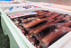 ![]() 鮮魚店に並んだスルメイカ=2025年3月14日午後1時29分、東京都品川区、山田暢史撮影 |