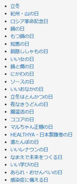 今日は何の日 (出典 雑学ネタ帳)![]() ![]() 立冬(11月7日頃 二十四節気) 「立冬(りっとう)」は、「二十四節気」の一つで第19番目にあたる。現在広まっている定気法では太陽黄経が225度のときで11月7日頃。 「立冬」の日付は、近年では11月7日または11月8日であり、年によって異なる。2025年(令和7年)は11月7日(金)である。 「立冬」の一つ前の節気は「霜降」(10月23日頃)、一つ後の節気は「小雪」(11月22日頃)。「立冬」には期間としての意味もあり、この日から、次の節気の「小雪」前日までである。 秋が極まり冬の気配が立ち始める頃なので「立冬」とされる。暦の上では冬の始まりとされ、この頃は太陽の光が弱くなり、朝夕など冷え込む日が増える。 江戸時代の暦の解説書『こよみ便覧(べんらん)』では「冬の気立ち始めて、いよいよ冷ゆれば也」と説明している。言い換えれば秋の極みとも言え、実際、多くの地域ではまだ秋らしい気配が残り、紅葉の見時でもある。 ![]() 紅葉した秋の山 「秋分」(9月23日頃)と「冬至」(12月22日頃)の中間で、昼夜の長短を基準に季節を区分する場合、この日から「立春」(2月4日頃)の前日までが「冬」となる。北国や高地では初冠雪の知らせが届く頃でもある。季語には「冬立つ」「冬入る」「冬来たる」などを用いる。 「立冬」の日付は以下の通り。 2016年11月7日(月) 2017年11月7日(火) 2018年11月7日(水) 2019年11月8日(金) 2020年11月7日(土) 2021年11月7日(日) 2022年11月7日(月) 2023年11月8日(水) 2024年11月7日(木) 2025年11月7日(金) 2026年11月7日(土) 日本で古くから冬の保存食として伝わる「干し柿」は、この頃に作り始める。干し柿は、よく晴れた日に天日に干して作られる。また、寒風にさらすことで乾燥が進み、甘みが増す。水分が抜けて甘みが凝縮された干し柿は、自然な風味が楽しめる。 「立冬」にちなんだ記念日は多く、「鍋の日」「巻寿司の日」「鍋と燗の日」「立冬はとんかつの日」「夜なきうどんの日」「腸温活の日」「ココアの日」「湯たんぽの日」「あられ・おせんべいの日」などがある |