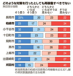 | 柏崎刈羽原発、「新潟県民の意思」どう反映 浮上する別のシナリオ 朝日新聞の記事です。 東京電力柏崎刈羽原発(新潟県)の再稼働の是非をめぐる県の意識調査は、原発から30キロ圏で再稼働に否定的な意見が目立つ結果となった。 その状況で、県庁内では11月中にも花角英世知事が判断を示すとの見方が強い。 「地元同意」の手続きが年内に終わるとの観測も出ている。(以下、省略) 本日の新聞の1面のトップ記事です。 賛否両論が拮抗しております。 その中で、刈羽村は賛成が多いようです。 |