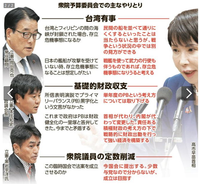 | 「存立危機事態」従来の政府見解を踏み越えた高市首相 台湾有事巡り 朝日新聞の記事です。 衆院予算委員会に初めて臨んだ高市早苗首相は、中国による台湾侵攻に関し「武力攻撃が発生したら(日本の)存立危機事態にあたる可能性が高い」と明言し、歴代内閣の公式見解を踏み越えた。 就任前からの持論だが、現役首相として中国を相手に集団的自衛権行使の可能性に踏み込んだ発言であり、今後の日中関係への影響も懸念される。(以下、省略) 本日の新聞の1面のトップ記事です。 高市氏の強気の発言です。 余り張り切らないでもらいたいものです。 |