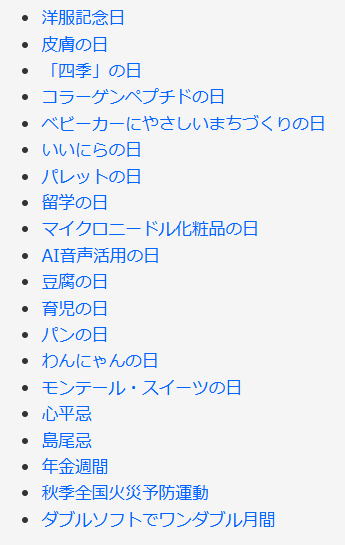 今日は何の日 (出典 雑学ネタ帳)![]() 洋服記念日(11月12日 記念日) 全日本洋服協同組合連合会が1972年(昭和47年)に制定。 1872年(明治5年)のこの日、「礼服ニハ洋服ヲ採用ス」という太政官布告が出され、それまでの公家風・武家風の和服礼装が廃止された。役人は大礼服・通常礼服を着用することとなった。 ![]() 太政官布告が出された当時の洋服 「洋服記念日」については、注文洋服業者により1886年(明治19年)に設立された東京都洋服商工協同組合が1929年(昭和4年)に記念日を制定したとの情報もあり、これが始まりと考えられる。 東京都洋服商工協同組合では、和服から洋服への採用を決断された明治天皇の御遺徳を崇敬し、毎年この日に明治神宮へ参拝し、明治神宮参集殿において記念式典を挙行している。 洋服(ようふく)とは、西洋服の略で、西洋風の衣服のこと。ヨーロッパの服飾に起源を持つが、列強各国の各地進出に伴なって、アメリカ大陸やオセアニアなどの植民地をはじめ、世界各地で広く用いられ、19世紀末以降の近代化とともに、中国や日本などでも使用されるようになった。 ![]() 洋服を試着しようとする人 この過程で、日本では「和服」や「着物」のように伝統的な衣服に対する概念として、これらの西洋起源の衣服が「洋服」と呼ばれるようになった。 現在では、背広やドレス、シャツとズボンやスカートの組み合わせなどの他、アメリカ合衆国を中心に発展した簡素なTシャツ、ジーンズなどが世界中で使用されている。今日の日本では、洋服が一般的になったため、単に「服」といえば洋服を指すことが多い。 |