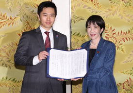 、![]() 合意書に署名し、写真撮影に臨む自民党の高市早苗総裁(右)と日本維新の会代表の吉村洋文・大阪府知事=2025年10月20日、国会内 |