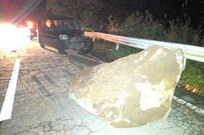 ![]() 道路をふさいだ大きな石。道路脇の斜面から落ちたとみられ、奥の軽自動車は前部が壊れていた =2025年11月25日午後7時29分、熊本県産山村、城戸康秀撮影 |