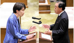 ![]() 党首討論に臨む高市早苗首相(左)、立憲民主党の野田佳彦代表=2025年11月26日、岩下毅撮影 |