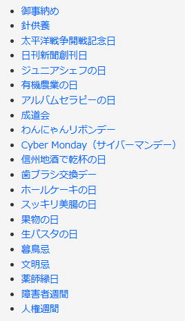 今日は何の日 (出典 雑学ネタ帳)![]() 御事納め(12月8日 年中行事) この日は農作業など一年の作業が終わる日であり、農事が終わることを祝って行った行事のことも意味する。 2月8日に農作業など一年中の行事の始まりである「御事始め(おことはじめ)」または「事始め」があるのに対し、この日はこれを終えることから「御事納め(おことおさめ)」または「事納め」という。 地方によっては「御事終い(おことじまい)」などというところもある。また、2月8日と12月8日をまとめて「事八日(ことようか)」という。 この日には、里芋・こんにゃく・にんじん・小豆を入れた「御事汁」を食べる風習があった。江戸時代や関東の一部では、12月8日を正月の儀式を始める「御事始め」とし、2月8日を正月の儀式を終える「御事納め」としていた。 この日に「針供養」をする地方もあるが、日付や行事の内容については地域差が大きい。また、これらの行事は戦後、徐々に行われなくなりつつある。 |