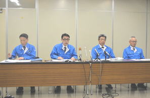 ![]() ガス漏れについての記者会見で経緯を説明する山口合同ガスの幹部ら =2025年12月4日午後5時1分、山口県下関市本町3丁目、白石昌幸撮影 |