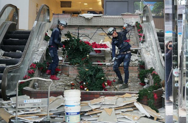 ![]() 地震の影響で壁が崩落したショッピングセンターで、倒れたクリスマスツリーを撤去する作業員ら =2025年12月9日午後1時46分、青森県八戸市、藤原伸雄撮影 |