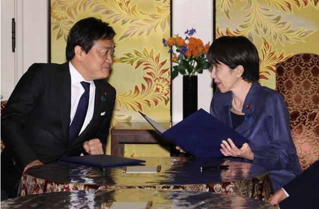 「年収の壁」を178万円に引き上げることなどに合意し、文書交換、写真撮影をした後、 言葉を交わす高市早苗首相(右)と国民民主党の玉木雄一郎代表 =2025年12月18日午後5時、国会内、岩下毅撮影 |