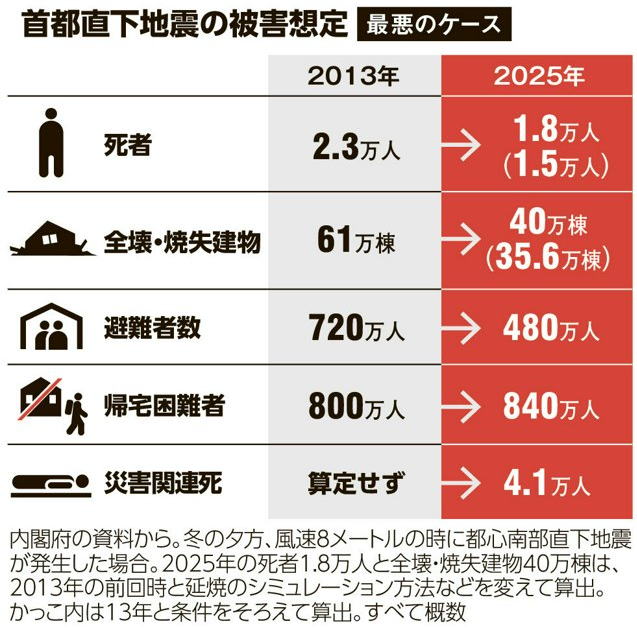 | 死者1.8万人、全壊・焼失40万棟 新たな首都直下地震被害想定 朝日新聞の記事です。 発生が迫っているとされる首都直下地震について、政府の有識者会議は19日、新たな被害想定をまとめた報告書を公表した。 地震の規模を示すマグニチュード(M)7級の地震が起きると最悪の場合、死者が1万8千人、全壊・焼失する建物が40万棟に上る。 内閣府は今年度末までに、今後の対策をまとめた基本計画を策定する予定だ。(以下、省略) 地震が実際に起きてみないと分かりませんが、目安として備えたいと思います。 梯子などを使う場合は、地震がおこっても良いように備えたいものです。 |