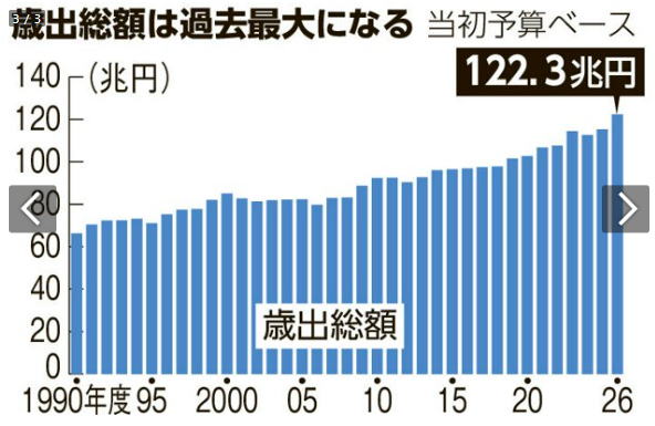 | 過去最大122.3兆円の当初予算案を閣議決定 物価や金利高を反映 朝日新聞の記事です。 政府は26日、一般会計の歳出総額が122兆3092億円となる2026年度の当初予算案を閣議決定した。 前年から7兆円余り増え、2年連続で過去最大となった。 物価高や人件費の上昇、金利高を織り込んだことで規模が膨らんだ。 一方で、税収も大きく増えるため、新規国債の発行額は29兆5840億円と、2年連続で30兆円を下回る。(以下、省略) 来年度の予算が閣議決定されました。 過去最大の規模となりました。 |