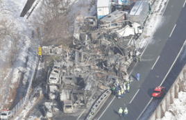 ![]() 多重事故が起きた関越道の事故現場 =2025年12月27日午前9時46分、群馬県みなかみ町、朝日新聞社ヘリから、小林正明撮影 |