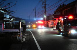 ![]() 山梨・扇山の山林火災は9日も延焼が続いた。 煙が立ちこめる現場近くの集落では日没後も消防が活動していた =2026年1月9日午後5時29分、山梨県上野原市、棟形祐水撮影 |