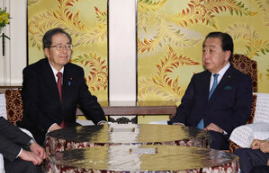 ![]() 会談に臨む立憲民主党の野田佳彦代表(右)と公明党の斉藤鉄夫代表 =2026年1月15日午後3時3分、国会内、岩下毅撮影 |