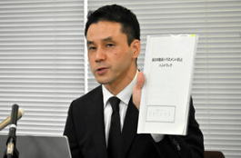 ![]() 神奈川県庁で記者会見し、「横浜市職員ハラスメント防止ハンドブック」を示す横浜市の久保田淳・人事部長=2026年1月15日午後2時18分、横浜市中区、関ゆみん撮影 |