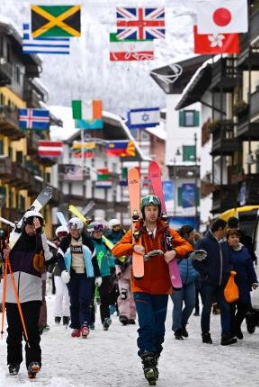 大勢の人でにぎわうミラノ・コルティナ冬季五輪のボブスレーなどが行われるイタリア・コルティナダンペッツォの中心部。7日未明に開幕する=5日(共同) |