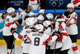 ![]() ミラノ・コルティナ冬季五輪のアイスホッケー女子1次リーグで、チェコに勝利し喜ぶスイス代表=6日、ロイター |