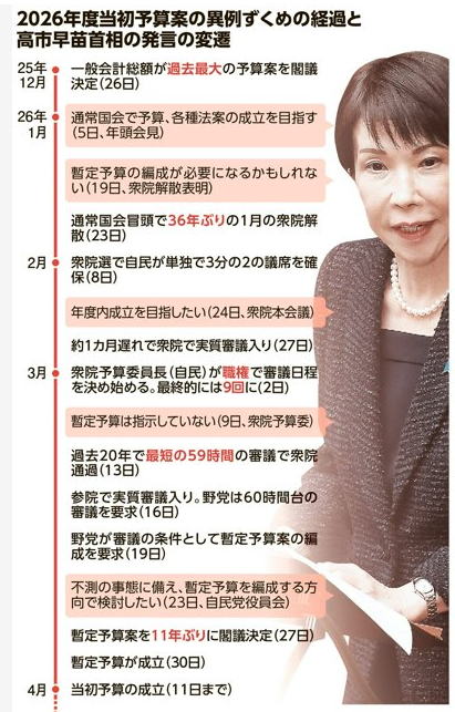 | 自民、当初予算の年度内成立断念 朝日新聞の記事です。 参院自民党の幹部は30日午前、野党側に対し、2026年度当初予算案の年度内成立を断念する考えを伝えた。 高市早苗首相(自民党総裁)はこれまで年度内成立を主張してきたが、成立時期の先送りは不可避となった。 当初予算成立までの「つなぎ」となる暫定予算案は30日午前の衆院予算委員会で審…(以下、省略) 本日の新聞の1面のトップ記事です。 高市氏はついに予算の年度内成立を断念しました。 参院では数の力を発揮できませんでした。 |