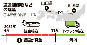 | 速達の配達、一部で遅れ 輸送方法切り替えで、日本郵便は公表せず 朝日新聞の記事です。 日本郵便の速達や、配達日を指定した郵便物の一部が、定められた配達日の翌日以降に配達されていたことがわかった。 2024年4月に輸送方法を切り替えた際に遅延が生じたという。 同社はこの配達遅れを公表していない。(以下、省略) 日本郵便によると、遅延が確認されたのは、山口県から新潟県宛てに差し出された速達などの郵便物。 日本郵便は公式サイトで速達の配達日数を示しており、山口から新潟宛てに午後に差し出された速達などは翌日夕方までに届くとされているが、一部の配達が翌々日などになっていた。 |