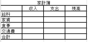 下のような表を作る。![]() ①1行目のA~Dまで、ドラッグする(下図参照)。 ②リボンの「セルを結合して中央揃え」をクリックする(下図参照:赤矢印)。 ![]() ③あらわれた画面の「セルを結合して中央揃え(C)」をクリックする。 ④すると下図のようになるので、「家計簿」と入力する。 ⑤2行目に「収入」「支出」「残高」と入力する。 「収入」を入力したら、「Tab」キーを押すとカーソルが右隣のセルに移動する。 ⑥「収入」「支出」「残高」の3つのセルをドラッグして、「中央揃え」をクリックする(下図参照:赤矢印)。 ![]() ⑦すると、下図のように文字が中央になる。 ⑧3行目に、「給料」「家賃」「交通費」「合計」と入力する(下図参照)。 「給料」を入力したら「Enter」キーを押すと、カーソルが下の行に移動する。 ![]() ⑨「家計簿」の行を除いた表全体をドラッグする(下図参照)。 ![]() ⑩罫線をクリックします(下図参照)。 ![]() ⑪あらわれた画面の「格子(A)」をクリックする(下図参照)。 ![]() ⑫罫線が入って完成です。 ![]() |