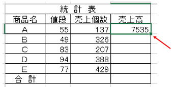 下の表の計算をしたい。![]() ①A行の売上高のセルをクリックする(下図参照)。 ![]() ②すると計算式の表示があらわれる(下図参照)。 ③空白の窓に、=B3*C3 と入力する。 ④すると、計算結果があらわれる(下図参照)。 ![]() 7353の表示の右下隅にある印を左クリックしたまま、E行のセルまでドラッグする。 すると、売上高の計算を一瞬にして処理してくれる(下図参照)。 ![]() ⑤合計行の売上個数のセルをクリックしてΣをクリックすると合計を計算してくれる。 同様に、合計行の売上高のセルをクリックしてΣをクリックすると合計を計算してくれる。 ⑥計算結果は、下図のようになる。 ![]() |
