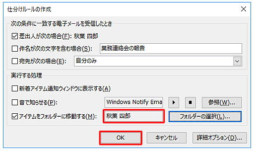 メール 受信メールをホルダーに自動的に振り分ける |