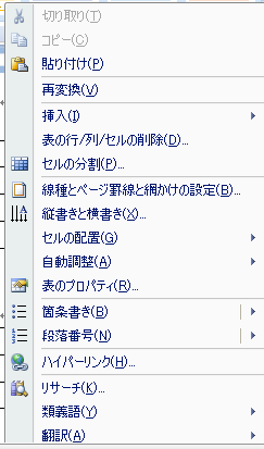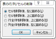 | ワードの文章の中の表の中で行を削除したい、列を削除したい、セルを削除したい場合の方法を考えます。 1つのセルを削除する方法 ここでは1行目の1列目のセルを削除する方法を考えます。 ①1行目の1列目のセルの上で、右クリックします。 ![]() ②すると下の図があらわれますので、「表の行/列/セルの削除(D)」をクリックします。 ③すると下の図があらわれますので、「セルの削除後、左に詰める(L)」をクリックします。 ④すると下の図のようになり完成です。 ![]() 列を削除する方法 削除したい列の上で右クリックすると②の図が出るので、「表の行/列/セルの削除(D)」をクリックします。 ③の図が出るので、「列全体を削除後、左に詰める(C)」にチェックを入れます。 行を削除する方法 削除したい行の上で右クリックすると②の図が出るので、「表の行/列/セルの削除(D)」をクリックします。 ③の図が出るので、「行全体を削除後、左に詰める(R)」にチェックを入れます。 |